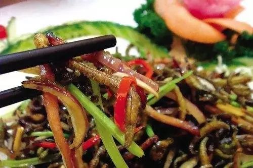 将禾虫配以猪肉丝、叉烧丝、灯笼椒丝