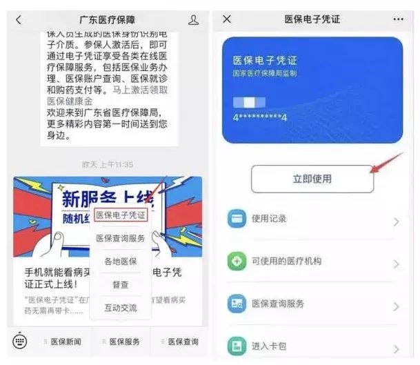 答:完成医保电子凭证激活后,点开“广东医疗保障”微信公众号,进入菜单栏“医保服务”—“医保电子凭证”—“立即使用”即可。
